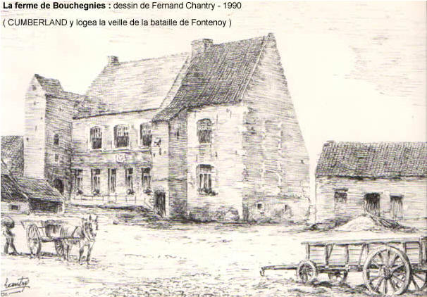 des Prés. Mais Bouchegnies allait bientôt subir un désastre. En effet, à la veille de la bataille de Bouvines (1), livrée le 27 juillet 1214, les troupes de Philippe-Auguste, en marche vers Tournai, la dévastèrent puis l’incendièrent de fond en comble; quatre-vingts ans plus tard, les derniers travaux de réparations n’y étaient pas encore achevés ! Au début du XVe siècle, Bouchegnies était encore la principale ferme de l’abbaye Saint-Nicolas des Prés. Elle fut la dernière délaissée par les religieux et cédée en location à des fermiers. Quand les religieux habitaient la ferme, ceux-ci ne cuisaient pas leur pain; il leur était envoyé de l’abbaye. Au fil du temps la ferme de Bouchegnies subit encore certaines dévastations causées par les guerres. Dans la première moitié du XVIe siècle, l’abbé VIVEQUIN la restaura. En 1688, l’abbé PORTOIS fit construire un nouveau corps de logis et y plaça ses armoiries (deux palmes, une crosse et une mitre). Elles y sont toujours aujourd’hui, sous la baie centrale, un peu détériorées par les intempéries, mais on y lit encore facilement la devise « UBI CHARITAS IBI DEUS » ainsi que les initiales N.P. De part et d’autre de ce cartouche de pierre sculptée rectangulaire qui s’étale sur la façade figure le millésime cimenté en graphie ancienne ANNO 1688. Bien des événements se sont passés depuis lors. En 1794 les Français se rendirent maîtres de notre pays, et on sait ce qu’il advint des biens des établissements religieux. Bouchegnies, pour sa part, fut cédée à des particuliers. Les familles Leduc-Servant, Dereux-Leduc et Jurion s’y sont succédé. Ces dernières années, les nouveaux occupants ont aménagé les dépendances en salles de fêtes, réunions et banquets. La ferme de Bouchegnies n’a donc plus tout à fait l’aspect qu’elle avait il y a plusieurs centaines d’années, mais elle reste un témoignage d’un glorieux passé. (1) Bataille de Bouvines : victoire remportée à Bouvines (au S-E de Lille) par le roi de France Philippe-Auguste, soutenu par les milices communales, sur l’empereur germanique Otton IV et ses alliés, Jean sans Terre et le comte de Flandre |