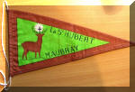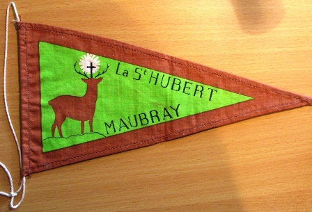 2. Fanion : Un fanion-souvenir fut créé en 1964 ; de forme triangulaire, aux couleurs brune et verte, il exhibe un cerf avec la croix entre les bois et porte l’inscription « La Saint-Hubert – Maubray ».
