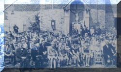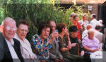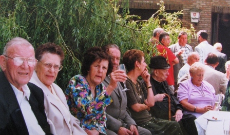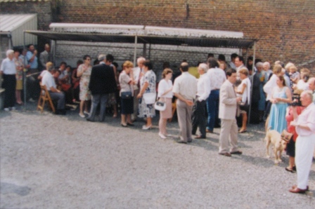 6.     En 2001, l’abbé DEPAUW, qui s’était retiré dans un home quelques années auparavant, s’est fait un plaisir de venir célébrer l’office ; il apparaît ci-après, chapeauté et une canne à la main, en compagnie de ses anciens paroissiens, lors de l’apéritif.