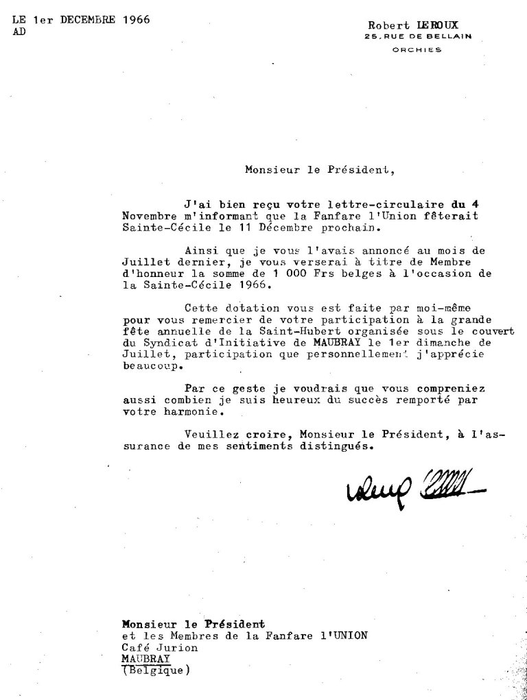 Robert LEROUX s’est toujours montré reconnaissant vis-à-vis de la Fanfare l’Union, comme en témoigne une de ses lettres :