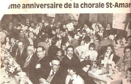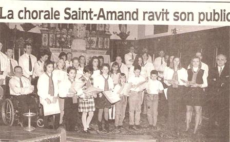 Le 5 février, la chorale Saint-Amand fête ses 15 ans d'existence (faute de documents, la naissance de la chorale ne peut être déterminée avec précision). Sous la direction de Robert Verdonck nous fêtons un double événement : les 15 ans d'existence de la chorale et les 10 ans de direction de Basile. La qualité du programme présenté démontre la vitalité du groupe vocal. Les morceaux interprétés sont à la fois contemporains et plus anciens (Palestrina)