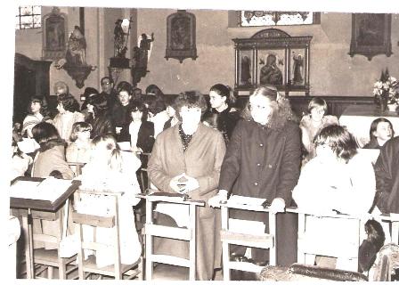 1984. Pour la première fois la chorale chante dans le coeur de l'église le dimanche 4 mars à la messe de 10 h 30. Messe de Saint-Amand et Sainte-Cécile de Jean Carlier (Wiers), "Au quatre coins de l'univers", "Ainsi soit-il" (Basile Verdonck), "Ta nuit sera lumière de midi", "Rassemblés dans la même foi", "Envoie des messagers".