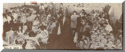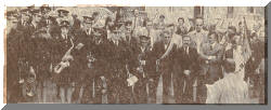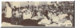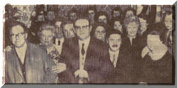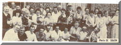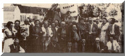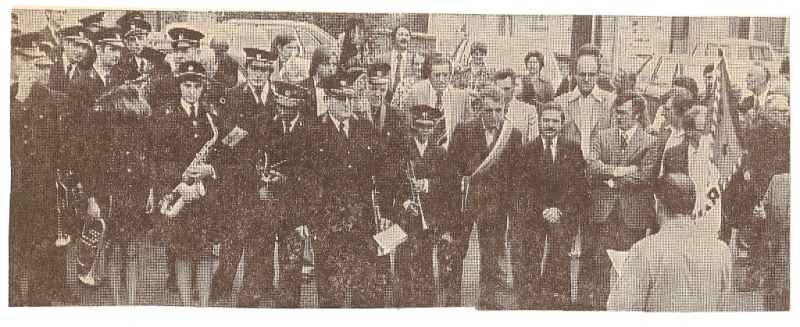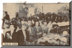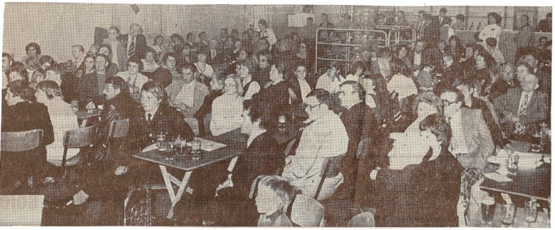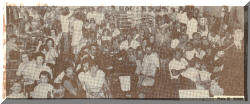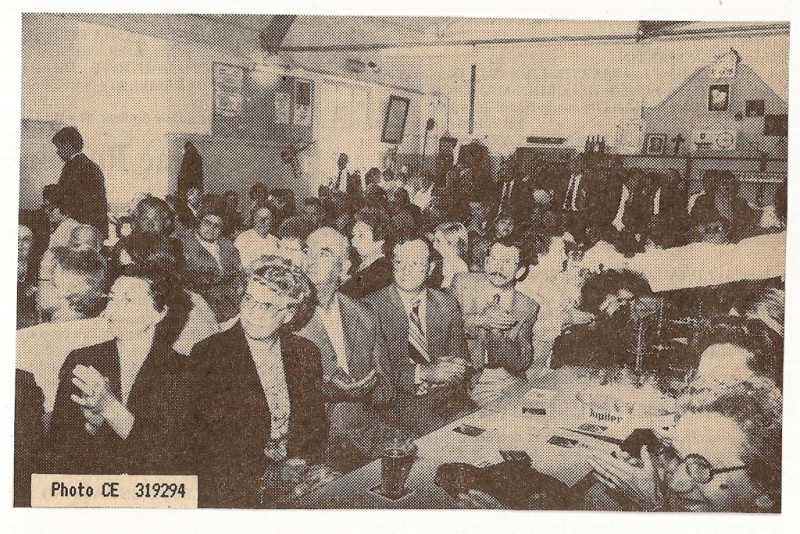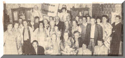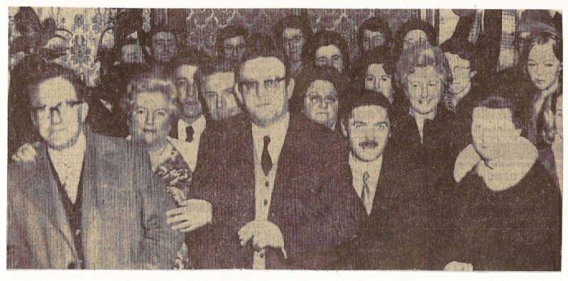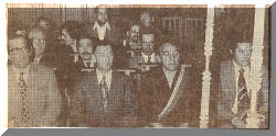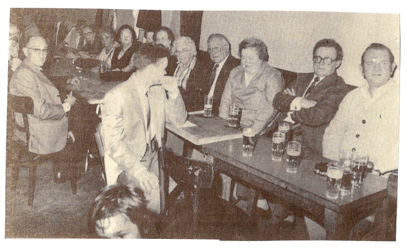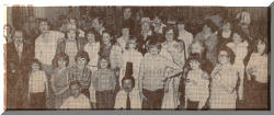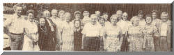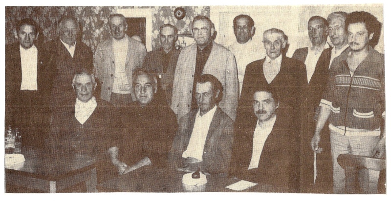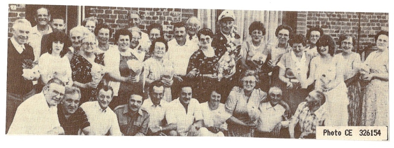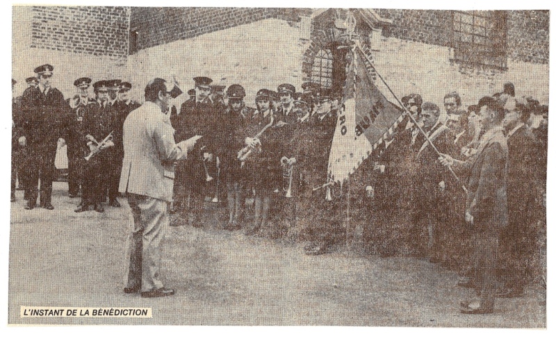 - A l’occasion du 10e anniversaire, en 1975, un drapeau fut béni et officiellement inauguré à l’issue de la grand-messe, célébrée aux intentions de la société, et en présence de la fanfare Sainte-Cécile de Gaurain-Ramecroix. Les trois photos suivantes montrent d’une part le Comité durant l’office religieux, et d’autre part la fanfare et les autorités à l’écoute de l’allocution du bourgmestre Maurice BRABANT. Notons que si Ghislain LOUETTE est sanglé de l’écharpe aux couleurs nationales, c’est parce qu’il était investi de la charge de « maïeur du Marais » !