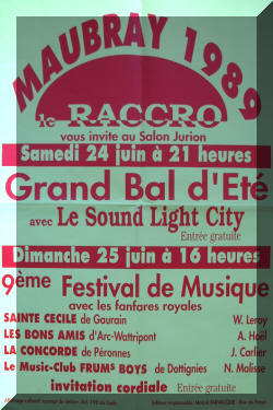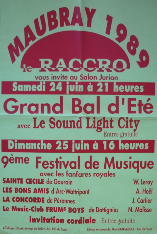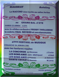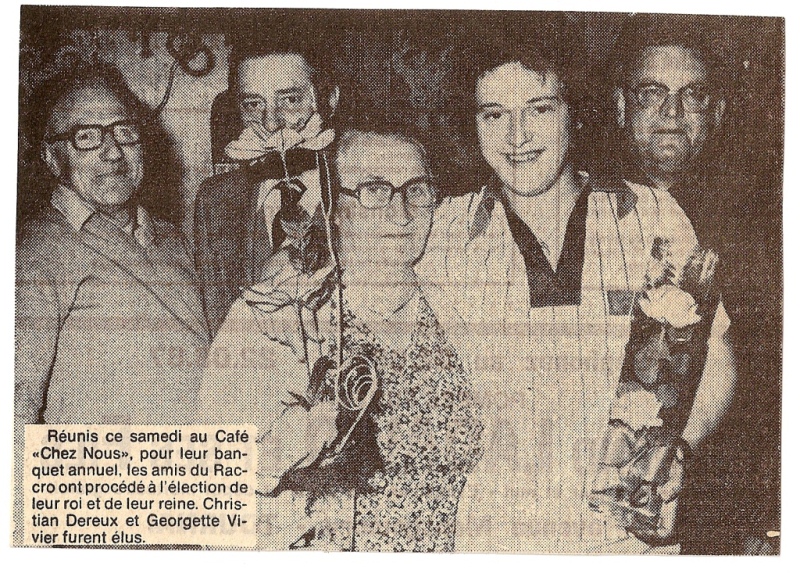 - En ce qui concerne les festivités estivales, qui au début duraient trois jours (« les trois jours fous du Raccro »), elles eurent lieu pendant près de 15 ans à l’arrière du café « Chez nous »; d’une tente de 200 mètres carrés au départ, on est passé à un chapiteau de 400 mètres carrés en 1971 par suite du succès rencontré. Les réjouissances étaient très variées et trouvaient leur point d’orgue le dimanche soir avec un bal toujours animé par un orchestre réputé.