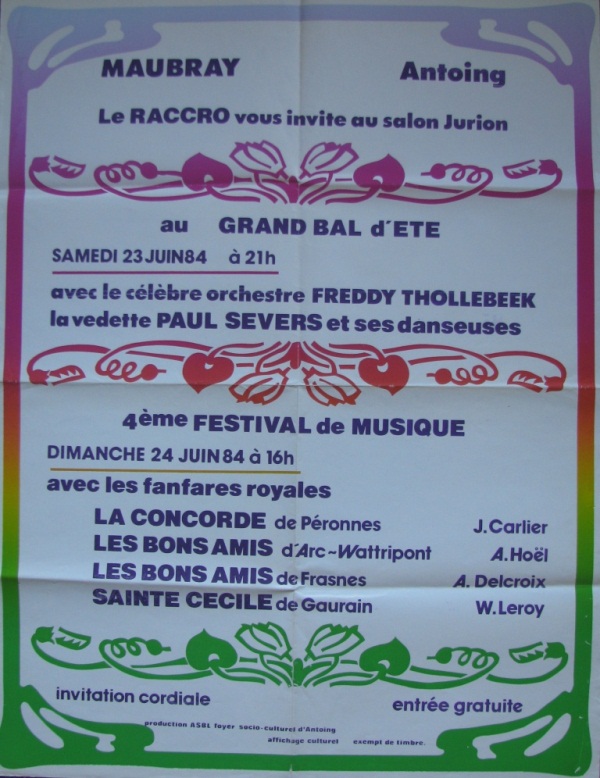 - De 1980 à 1993, les festivités d’été eurent lieu au Salon JURION; elles débutaient le samedi soir par un bal et se poursuivaient le dimanche après-midi par un festival musical où se succédaient chaque fois quatre formations, qui rivalisaient de qualité pour le bonheur des nombreux mélomanes. Les quelques photos prises dans les années 1980 témoignent du succès populaire rencontré :